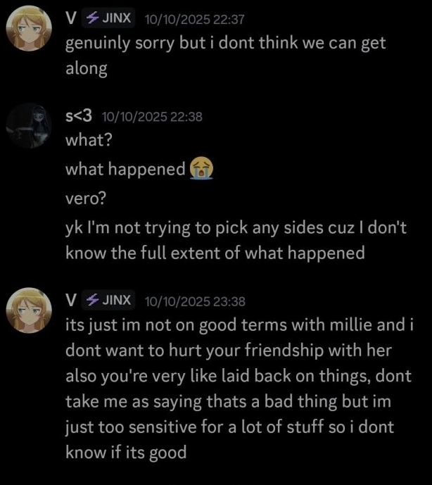 And after awhile I went on dms to text my irl bsf to go on vc with me, so I told her what happened and the drama and the noodle girl was my bsf and yes it was kinda messed up when I sended that but have you seen the video itself? no, than pulsar was saying "ban mills and noodles", " bann mills. " and that actually hurts? like wtf.. I mean yes understandable, but ur own friend going against you? that actually shattered my heart!? I'm not trying to sound dramatic.. But it's true? After that I texted him on WhatsApp and I said to him "why would you say that. " type of shii and that's how the argument started, calling me slurs and stuff like that.